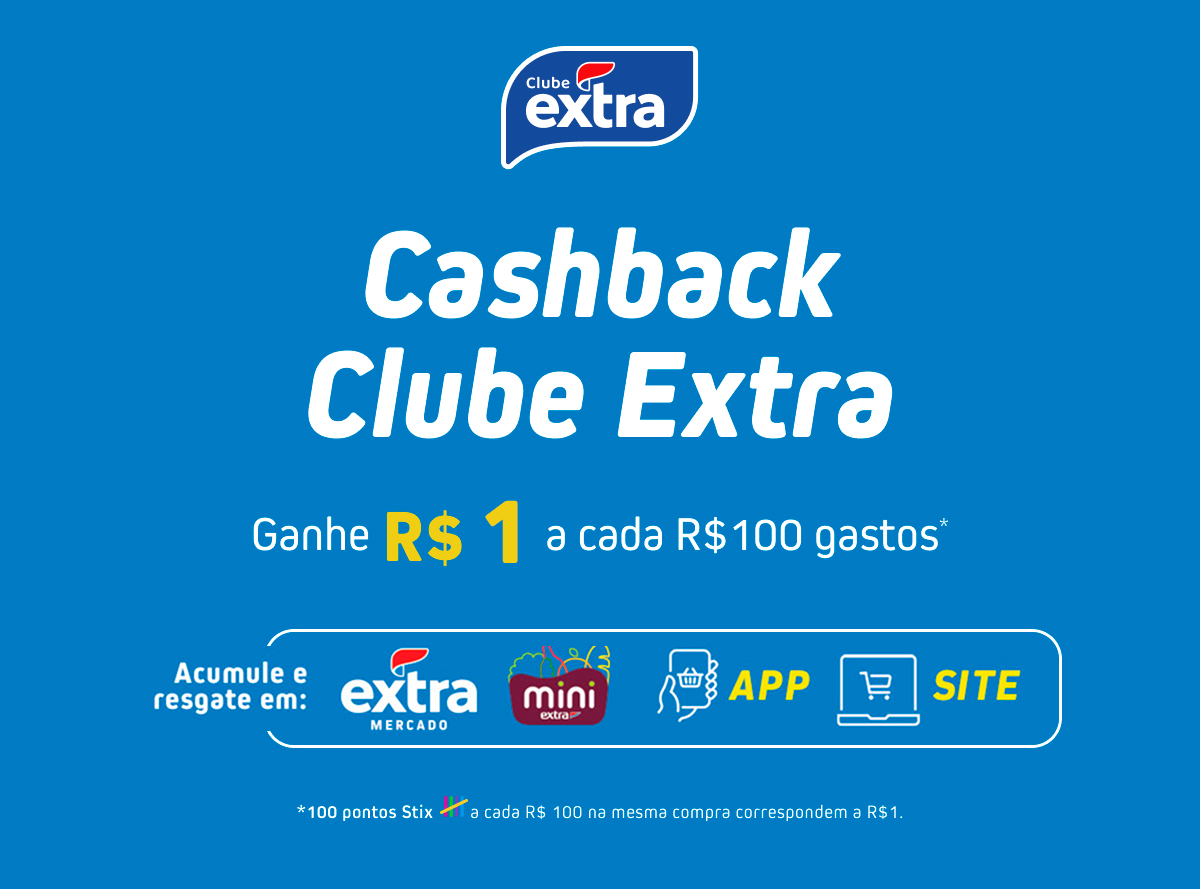 O Clube Extra é o seu clube de vantagens. Se você gosta de economizar e aproveitar benefícios exclusivos, vem com a gente! É só baixar o app, se cadastrar de graça, ativar as ofertas e informar seu CPF no caixa ao final de suas compras. Descontos personalizados, cashback nas suas compras e muito mais: tudo feito para você!
