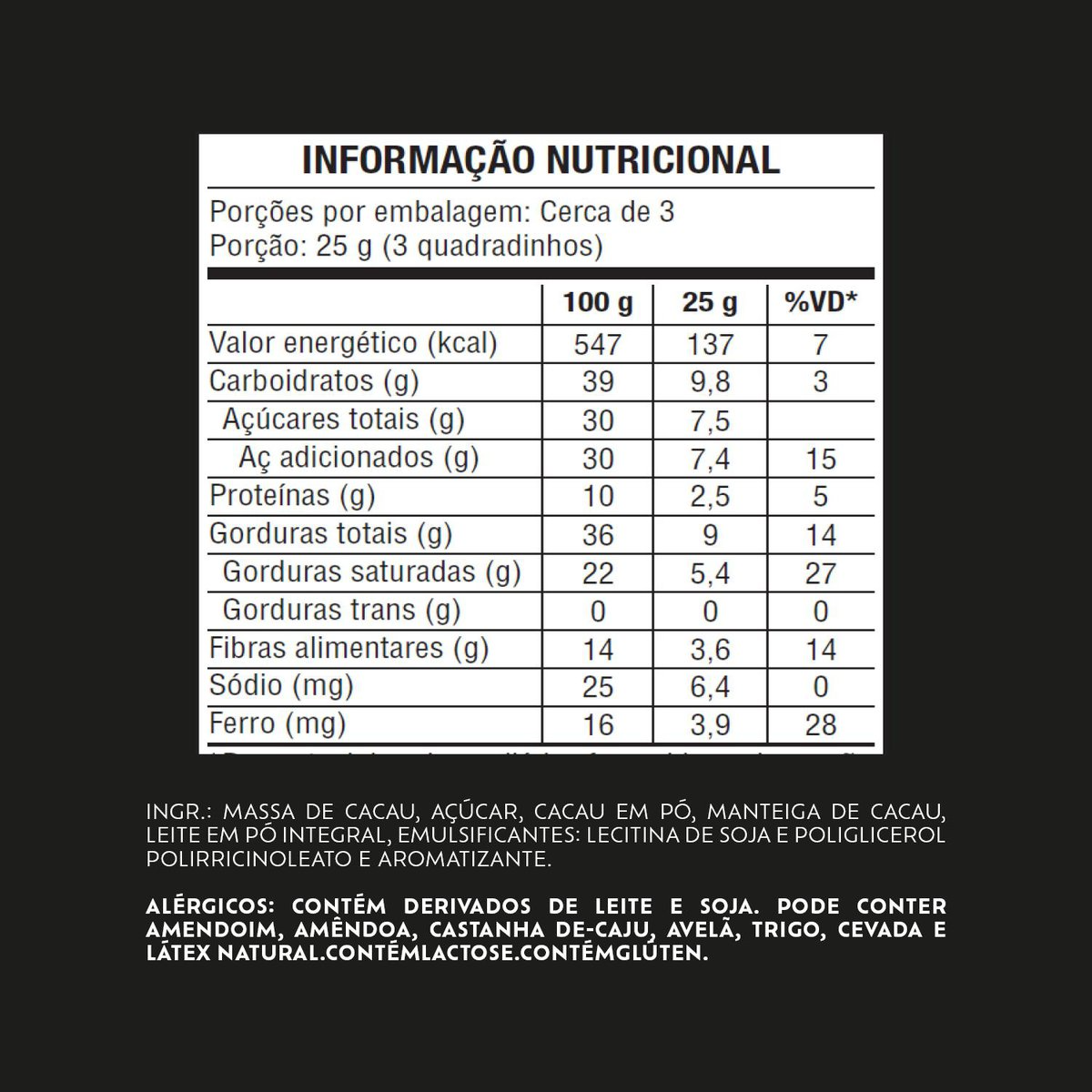 Ingredientes | Massa de cacau, açúcar, cacau em pó, manteiga de cacau, leite em pó integral, emulsificantes: lecitina de soja e poliglicerol polirricinoleato e aromatizante. |